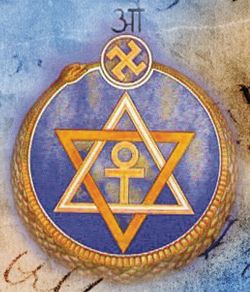 I det teosofiske segl er svastikakorset (fig. 4) placeret oven på slangesymbolet. Det er et brændende kors og symboliserer den hvirvlende energi, der skaber et univers. Det repræsenterer den 3. Logos, Helligånden, og må ikke forveksles med hagekorset, som er resultatet af nazisternes misbrug af dette ældgamle, hellige symbol.